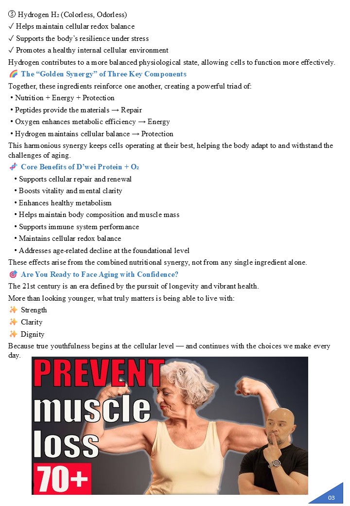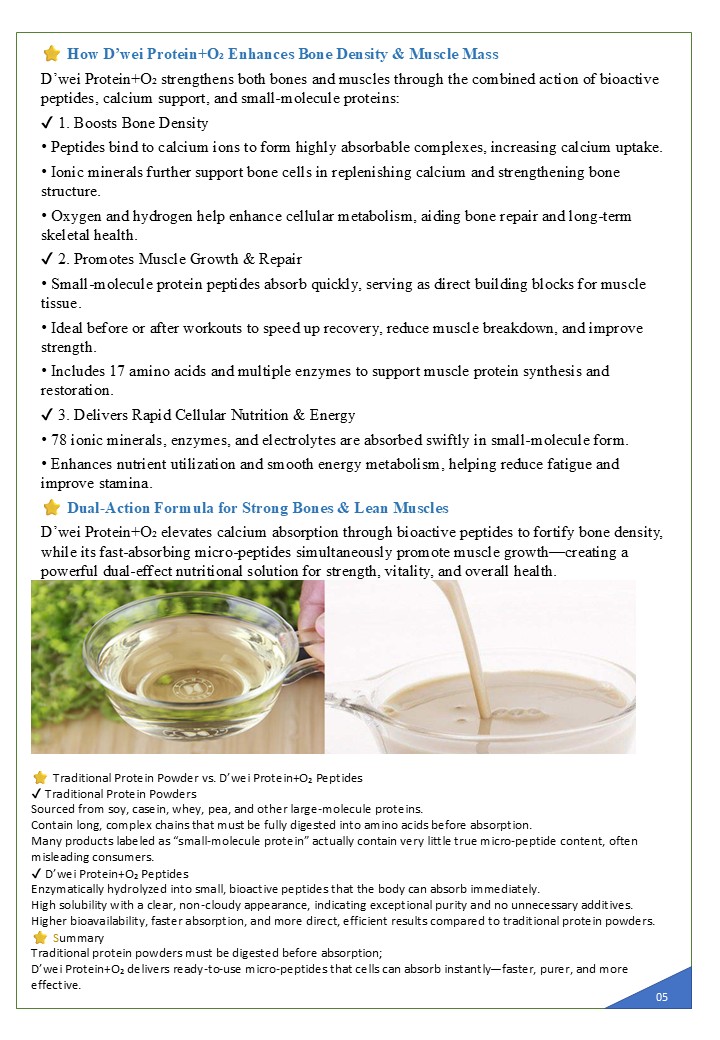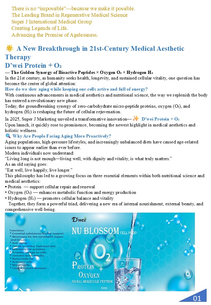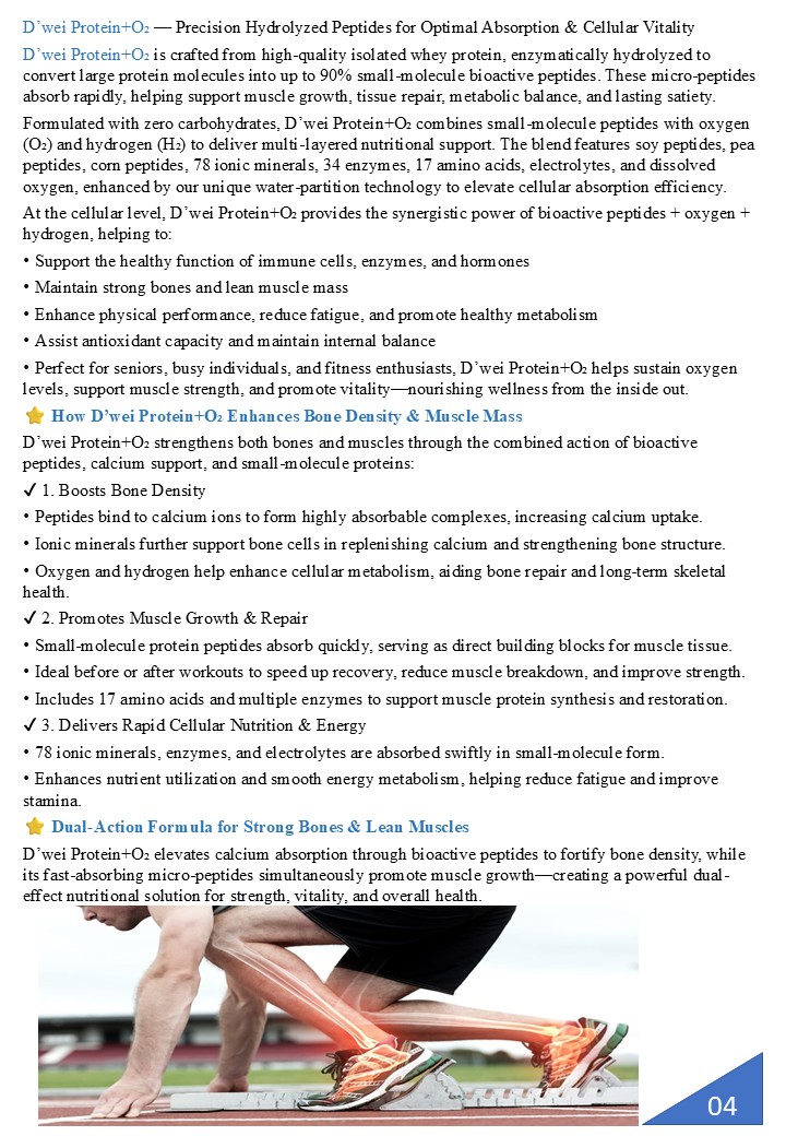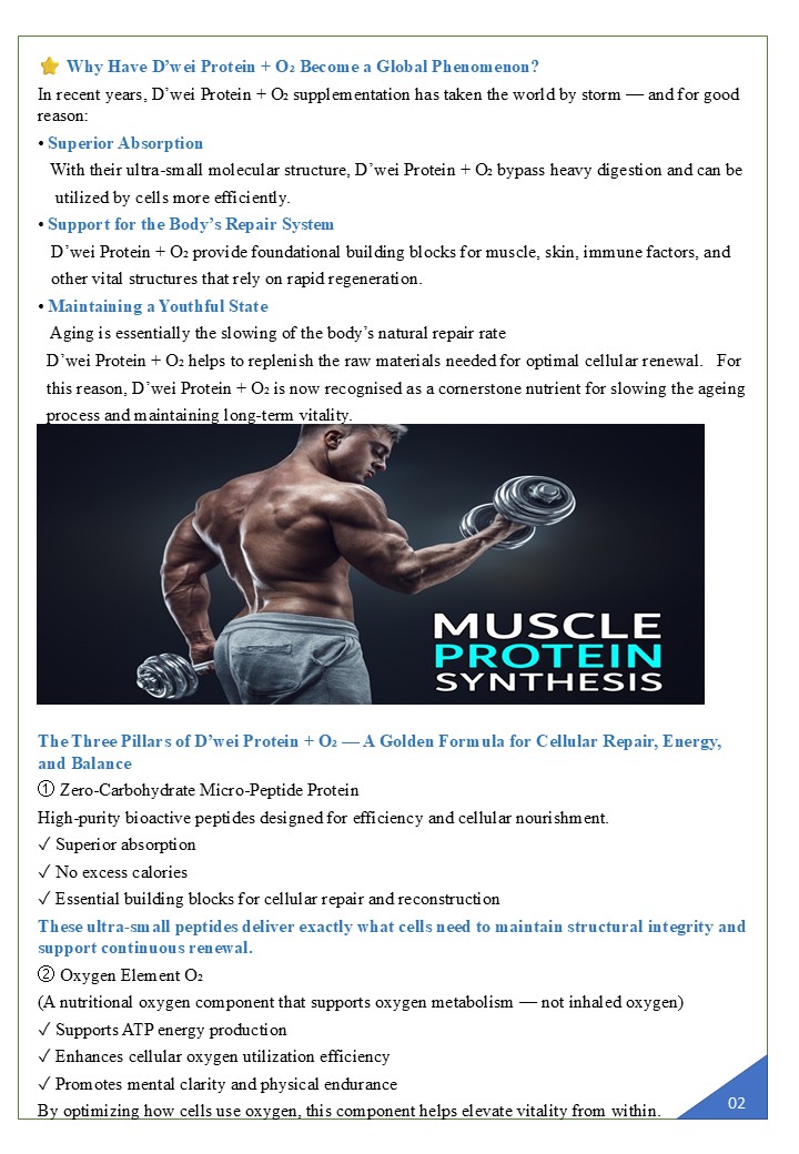 Protein + O₂ Micro-Protein Complex × Active Oxygen Energy Dual-Core Repair and Activation Technology In the fields of modern cellular nutrition and bio-energy science, the combination of micro-protein complexes and active oxygen energy is regarded as a revolutionary approach to promoting youthfulness, vitality and optimal cellular performance. This innovative fusion is celebrated as the essential pairing for cellular repair and energy rejuvenation. D’wei Protein + O₂ achieves this by precisely balancing structural restoration and energy activation. This empowers the body to reawaken its innate self-repair mechanisms at a cellular level, initiating deep restoration, revitalisation, and regenerative processes that restore life's fundamental energy. It is not just a supplement, but a cutting-edge cellular technology that guides the body back to its optimal state by providing comprehensive repair and enhanced resilience.