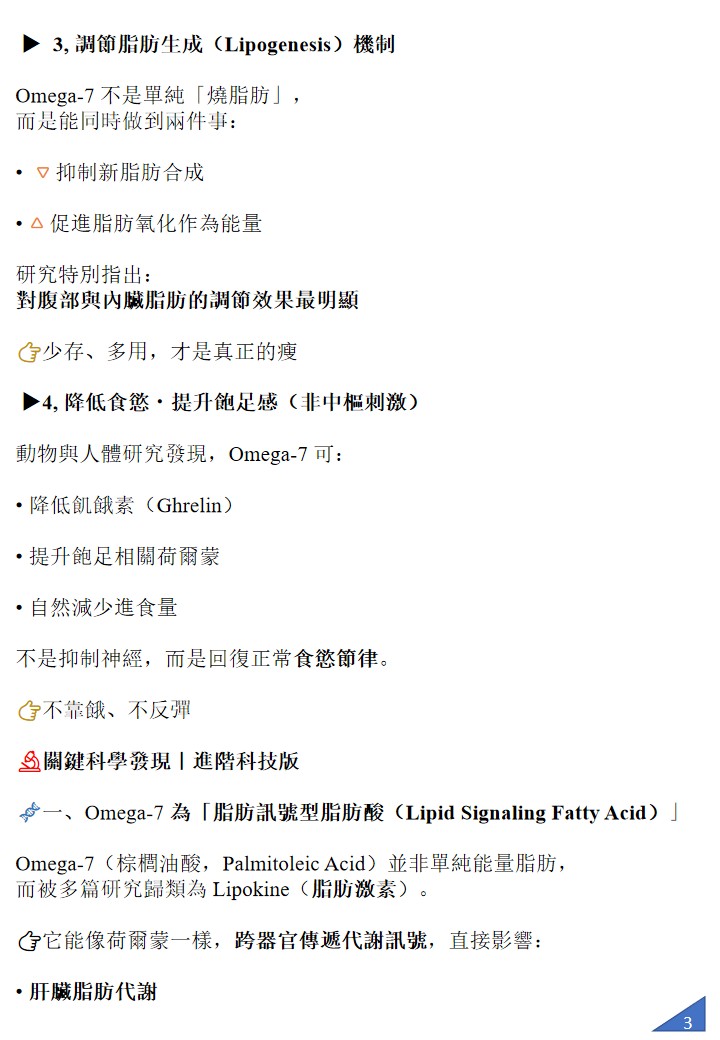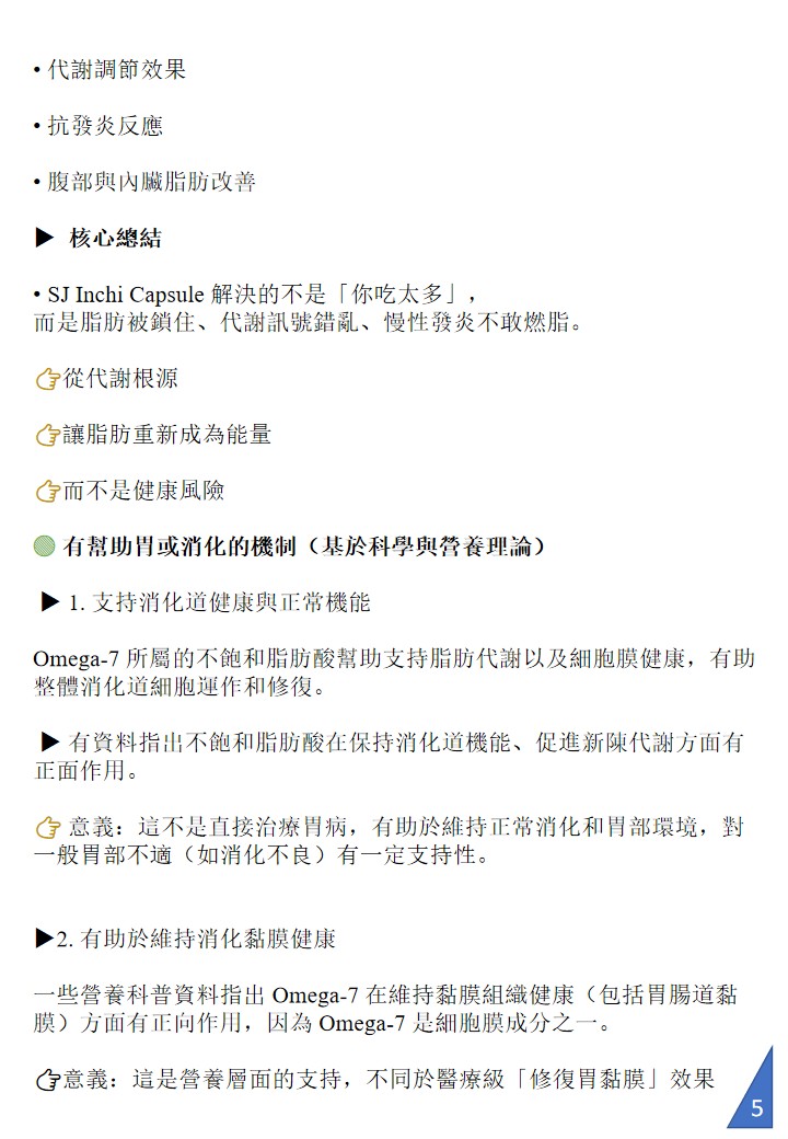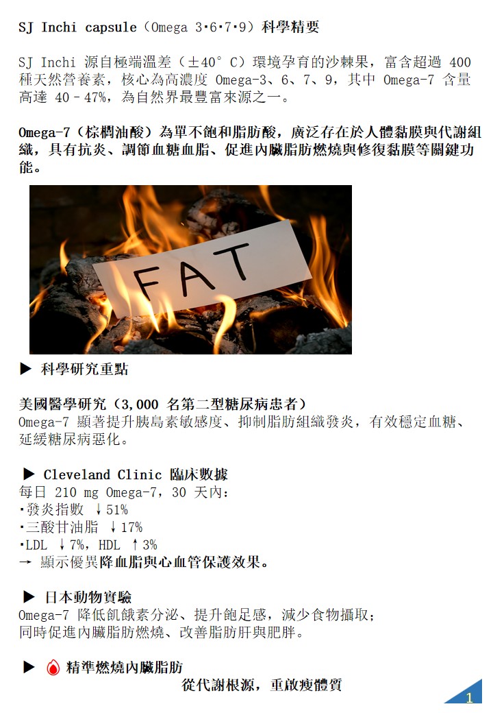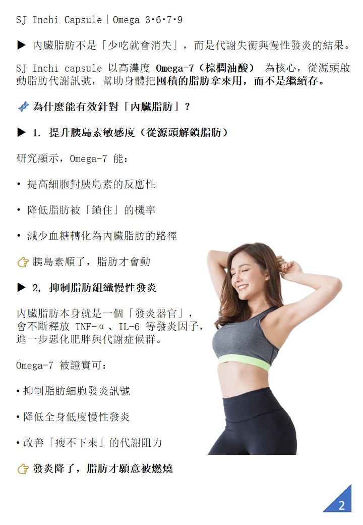 SJ Inchi 膠囊富含 Omega-3、6、7、9,尤其 Omega-7 廣泛存在於人體黏膜與代謝組織,具抗炎、調節血糖血脂、促進內臟脂肪燃燒與修復黏膜等關鍵作用,許多人用於維持健康體態的日常保健。 (棕櫚油酸)為單不飽和脂肪酸,廣泛存在於人體黏膜與代謝組織,具有抗炎、調節血糖血脂、促進內臟脂肪燃燒與修復黏膜等關鍵功能。