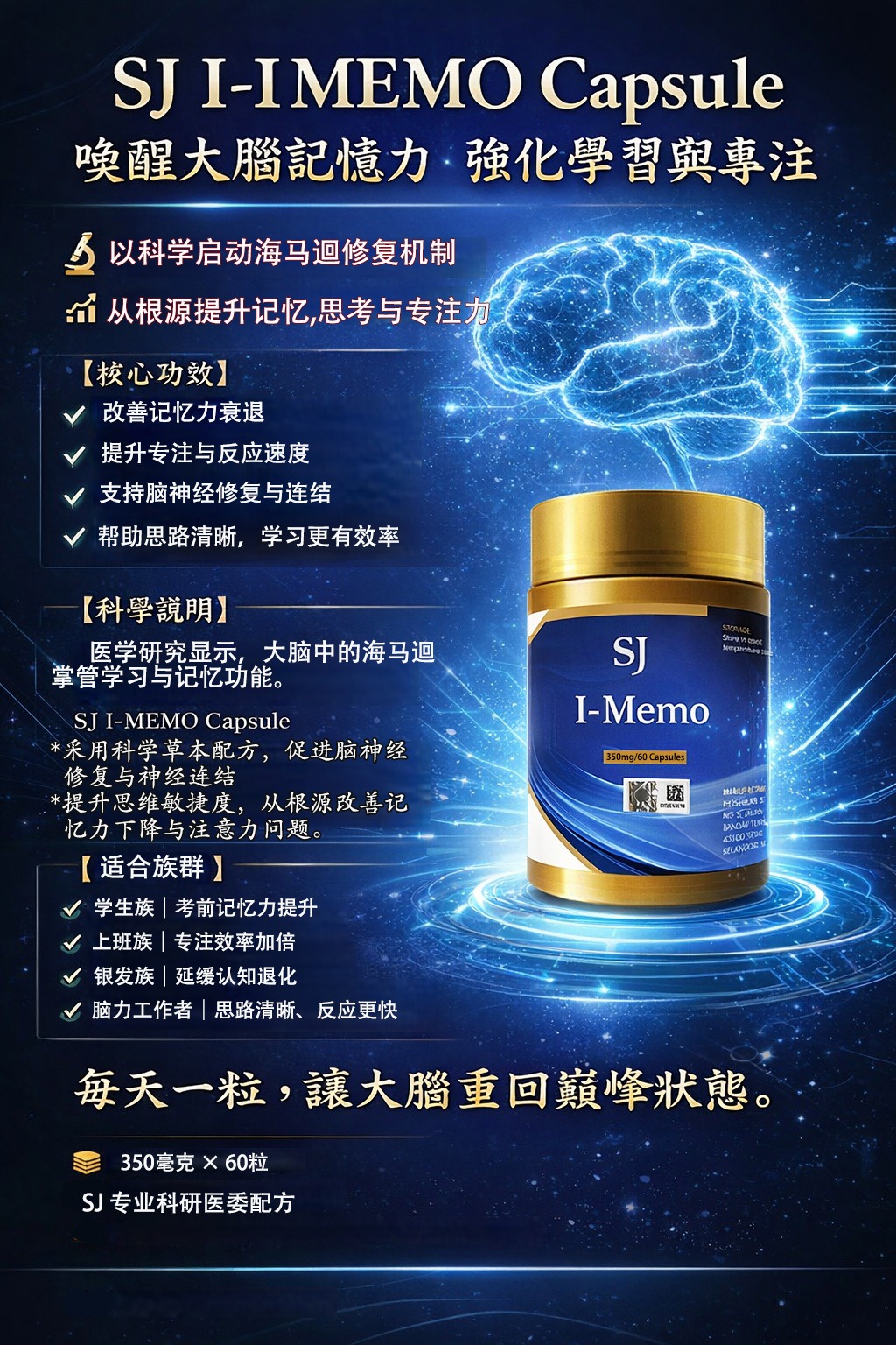I-Memo Capsule 是一款以科學為基礎、從細胞根源改善腦部功能的高端腦部營養配方,專為修復、保護與強化大腦而設計。