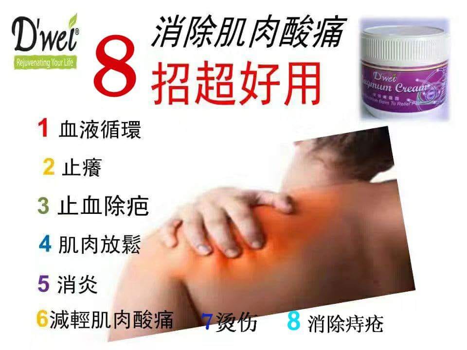 D'Wei Magmum Cream 含有植物油。 它的作用是减少体内引起疼痛和炎症的物质,对小关节效果最好。 D'Wei Magmum Cream 不能立即缓解,可能需要一段时间才能见效。