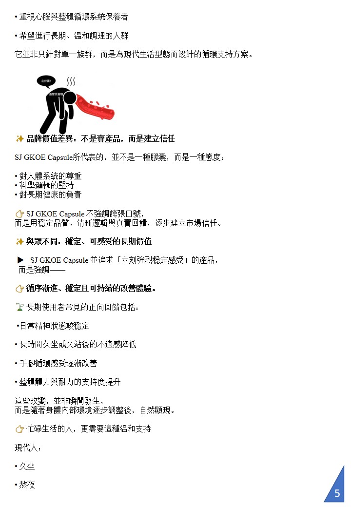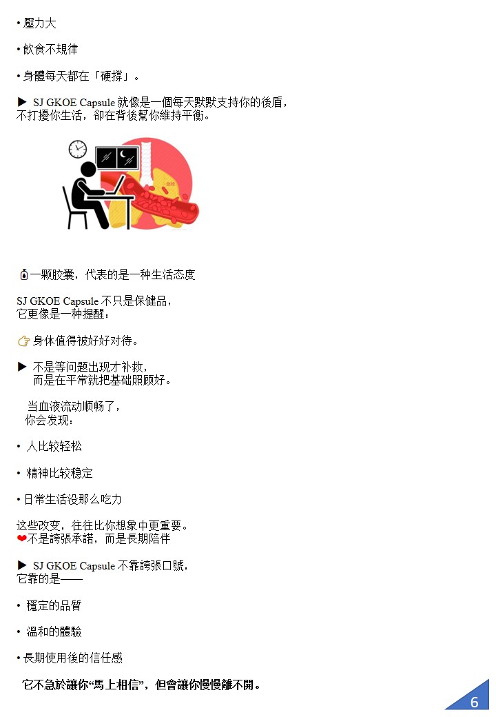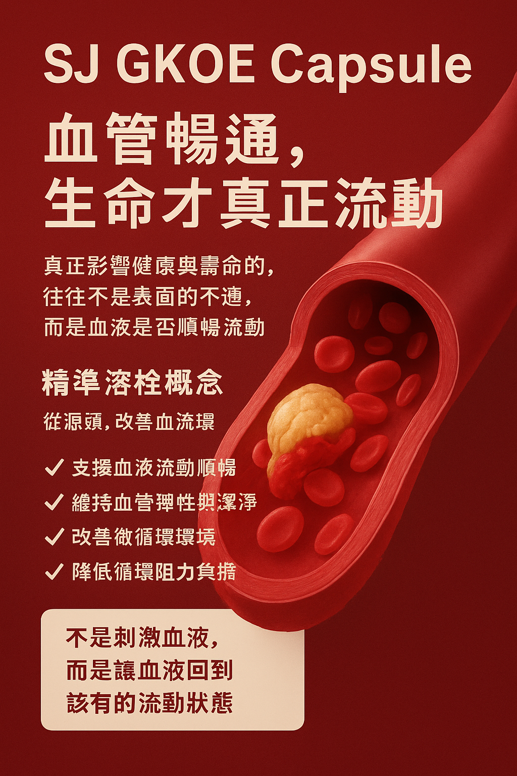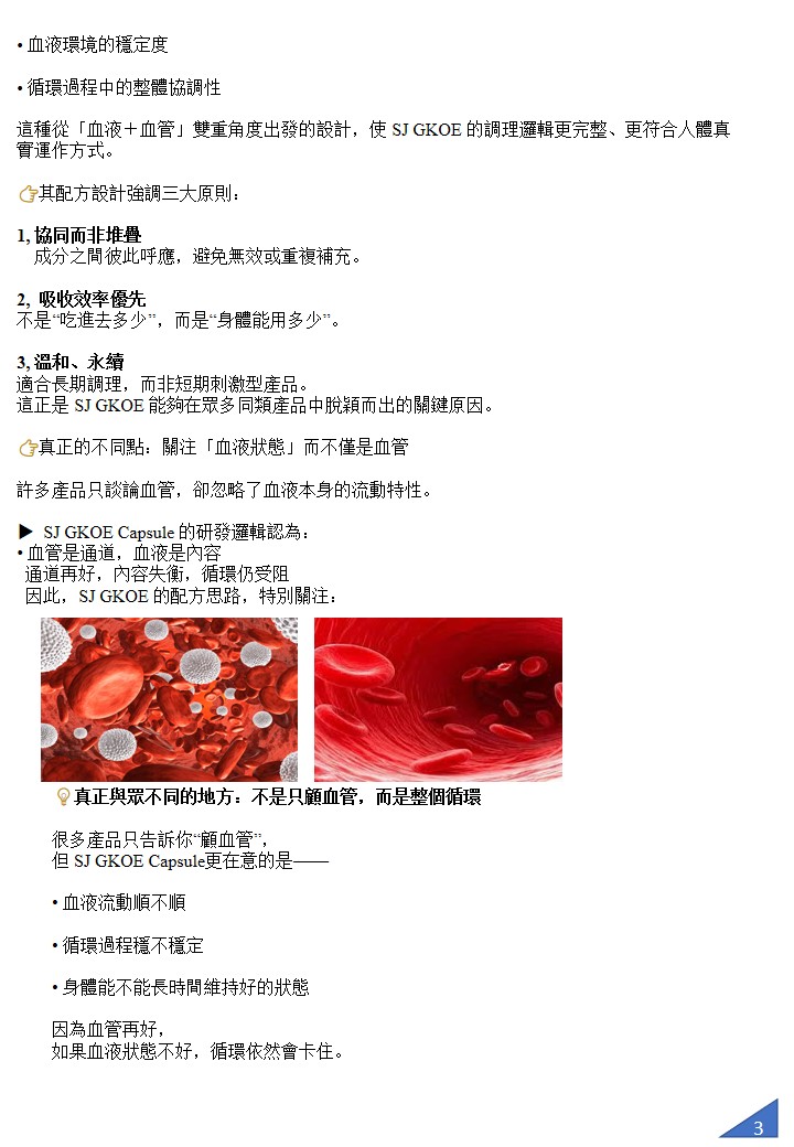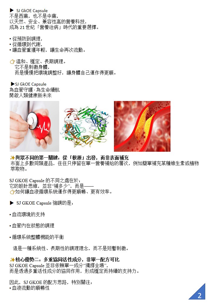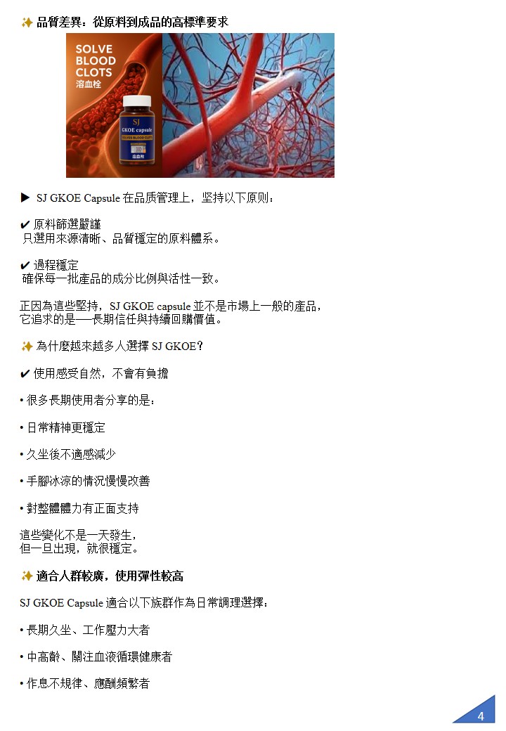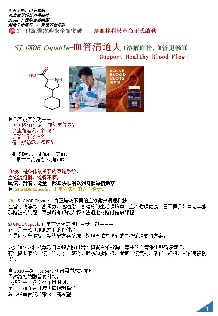 SJ GKOE capsule 心血管健康營養配方,專為分解清除血管雜質與血栓而設計。它的核心功效是幫助血液循環更順暢,減少血管阻塞風險,進而預防心梗、中風與「三高」等問題。 配方含有溶解血栓蛋白酶,並結合美國量子科技,使營養分子更細微、吸收更快,幫助身體自然分解血栓、清理血管沉積物與修復受損血管壁。常見回饋包括胸口不再悶、四肢麻木狀況改善、血壓更穩定等。