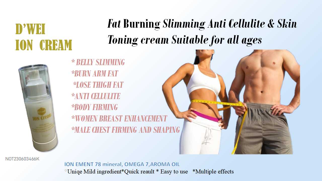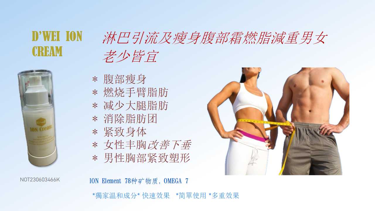 * 【D'wei ION Cream】:本產品是一款淋巴排毒瘦身產品,專為腰部、腿部、手臂設計。 並收緊腹部。易吸收,保濕滋養,使肌膚光滑細膩,有助於塑造美麗迷人的體態。