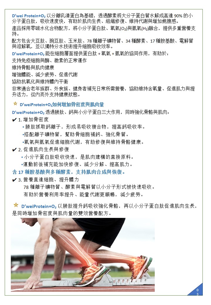 D’wei Protein + O₂ 蛋白質小分子複合 × 活氧能量成分 ——修復 × 活化的黃金雙核心科技 在現代細胞營養與生物能量研究中,「小分子蛋白質複合物」結合「活氧能量成分」被視為啟動年輕、健康與高效生命力的突破性配方。 這項技術被譽為——細胞修復與能量復甦的關鍵組合。 透過精準比例將「結構修護」與「能量活化」融為一體,D’wei Protein + O₂ 能從細胞層面喚醒身體的自我重建能力,啟動深層修復、活化與再生機制,為生命注入新的動力。 這不只是營養補充,更是引導細胞回到最佳狀態的前沿科技,帶來全方位的恢復、強化與重生。