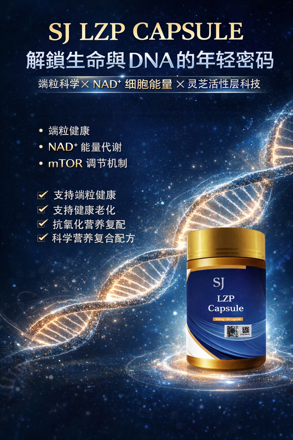 SJ LZP Capsule 是生命与DNA的“长生密码”,活到125岁不是梦! 采用量子与奈米科技,萃取红灵芝蛋白酶、灵芝多醣、65种胺基酸及烟酰胺单核苷酸,高吸收独特配方,支持男女长寿、健康、年轻活力、大脑功能与细胞能量。 SJ LZP 作用于 mTOR 通路,调节细胞生长与代谢机制,延长细胞寿命。以小分子结构提升生物利用度,帮助修复与再生细胞,活化老化细胞,促进DNA修复与代谢平衡。 自然营养补充,快速吸收,许多人首次服用即可明显感受改变。