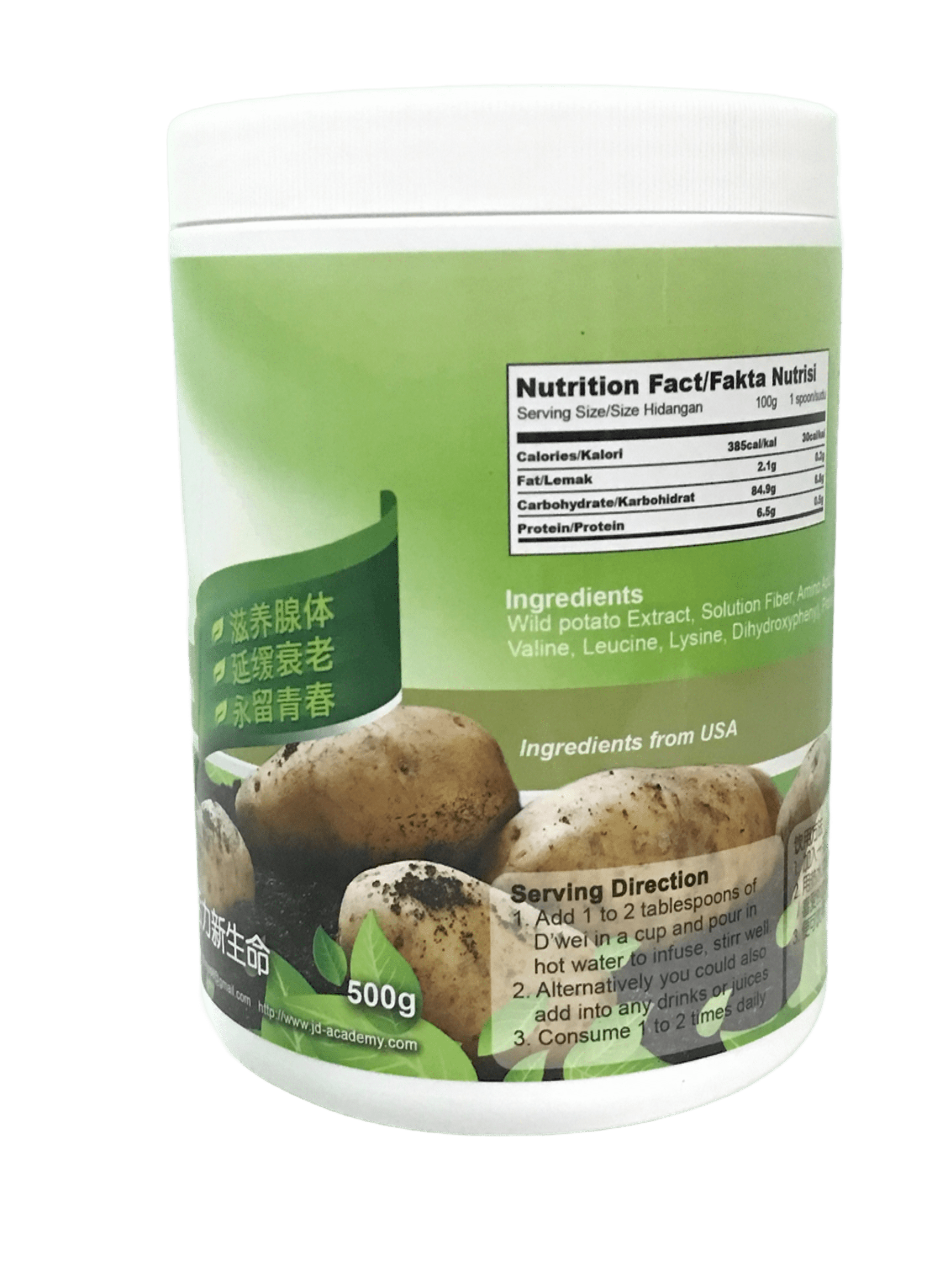 D` Wei Wild Potato 含有数千年来的美国野生马铃薯物质,因为它具有许多声称的益处和全谱的植物雌激素,包括薯蓣皂苷元、薯蓣皂苷和山药皂苷元。 生命的每一分钟都承载着它神奇的价值,帮助人们永葆青春,几个世纪以来人们一直在替代医学中使用它,并且由于其有效恢复荷尔蒙平衡而继续成为对医疗行业非常重要的激活激素分泌物质 ,孕妇产前产后滋补,更年期男性和女性的滋补,增强男女内分泌系统,年轻美丽,男女老幼滋补。